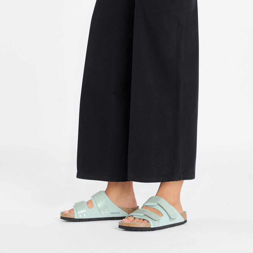 爽やかでスポーティな印象が素敵なBIRKENSTOCKのカジュアルサンダル、Ujiは、バックルでフィット感を調整できる便利さが魅力の一足です。普段着にスポーティなアクセントを添えたいあなたにぴったりのこの一足。光沢のあるクロ―ジャーが素敵なアクセントを添えています。中敷全面を柔らかいピヌマトレザーで覆ったハーフエクスクイジットフットベッドで極上の履き心地をお楽しみください。アッパーにはナチュラルなアピアランスが素敵な高級ソフトヌバックレザーを使用しています。